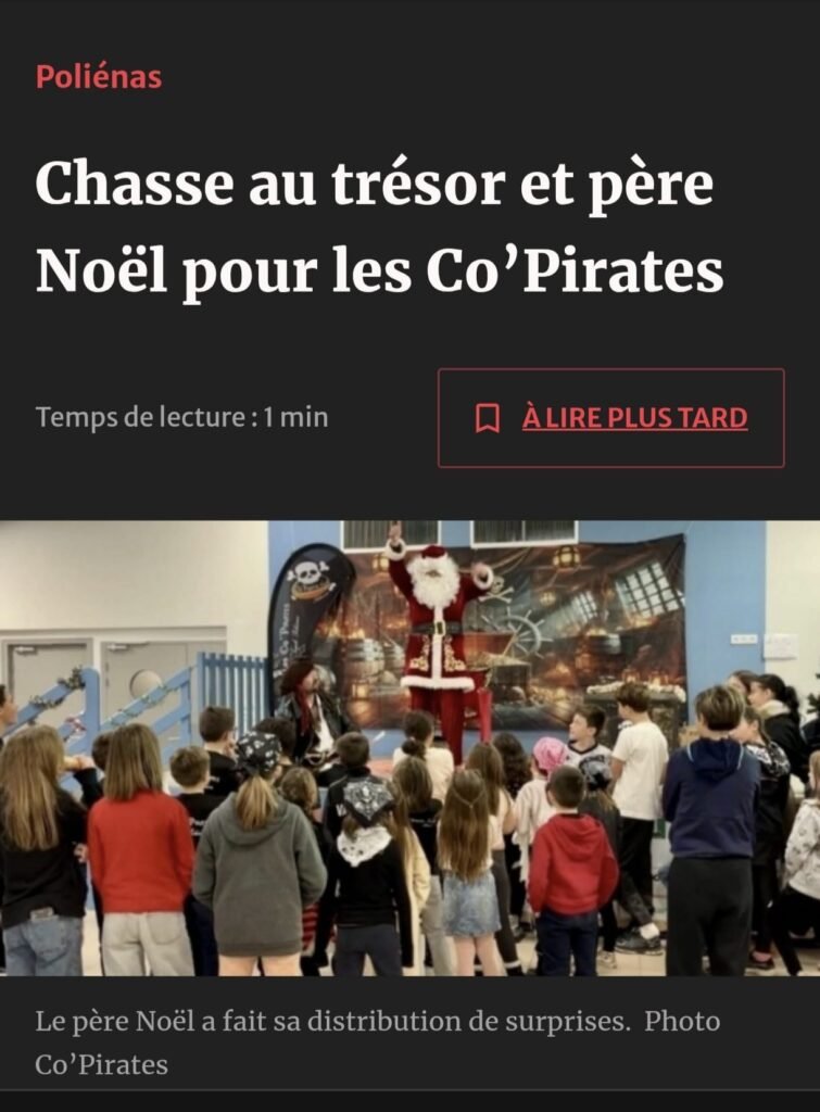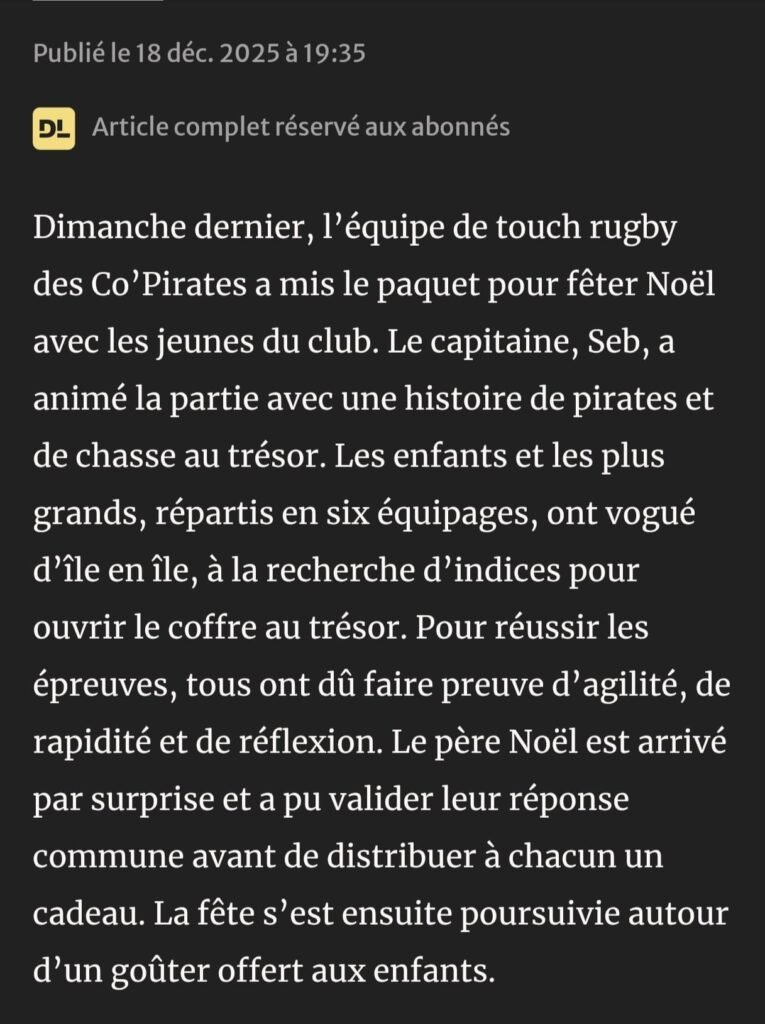 Dimanche dernier, l’équipe de touch rugby des Co’Pirates a mis le paquet pour fêter Noël avec les jeunes du club. Le capitaine, Seb, a animé la partie avec une histoire de pirates et de chasses au trésor. Les enfants et les plus grand, répartis en six équipages, ont vogué d’île en île, à la recherche…